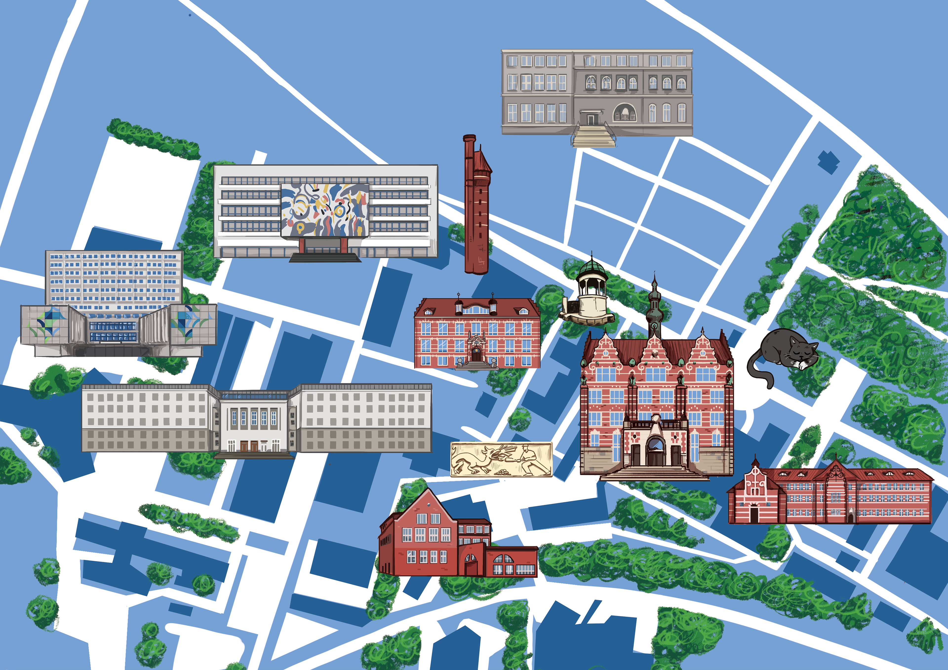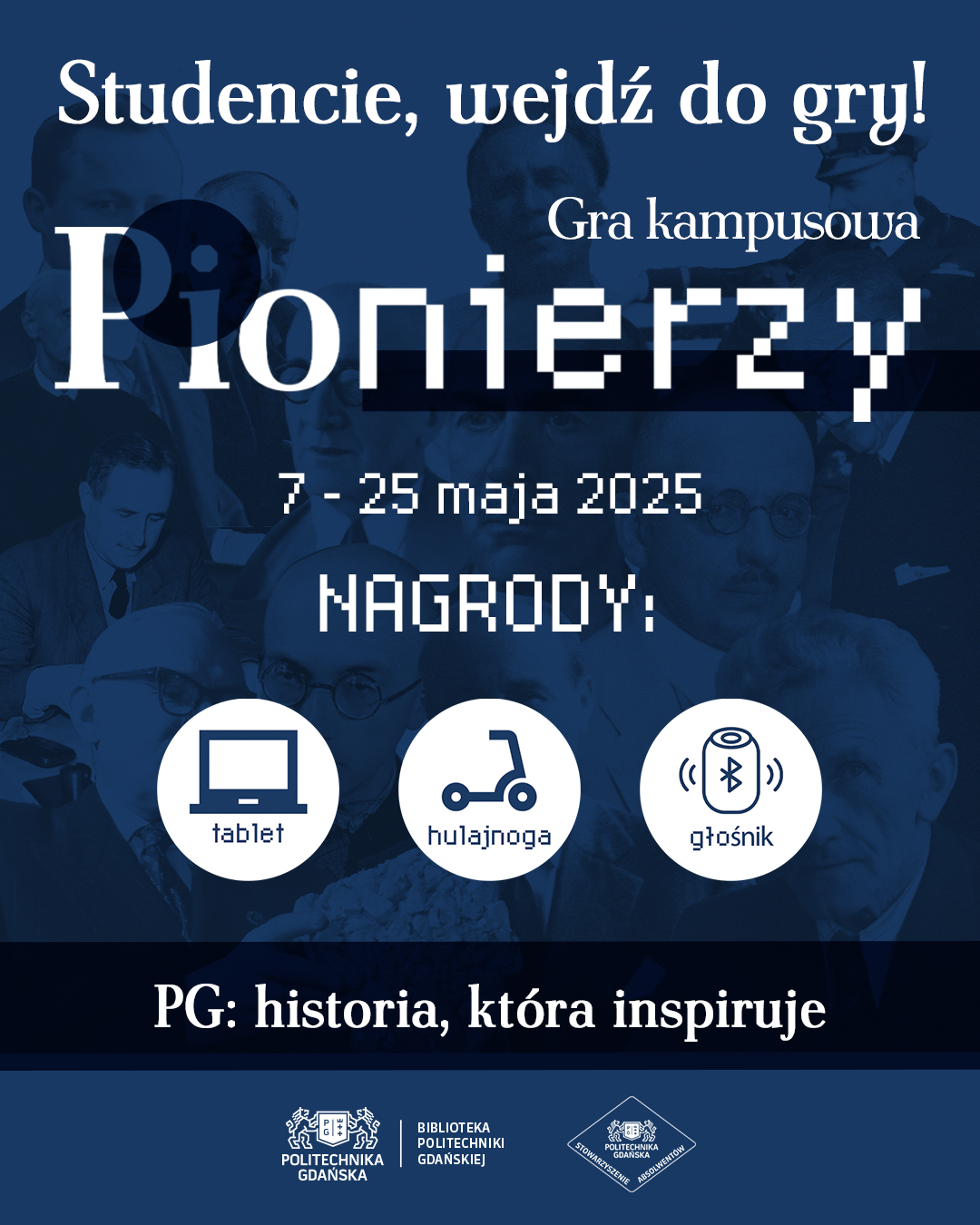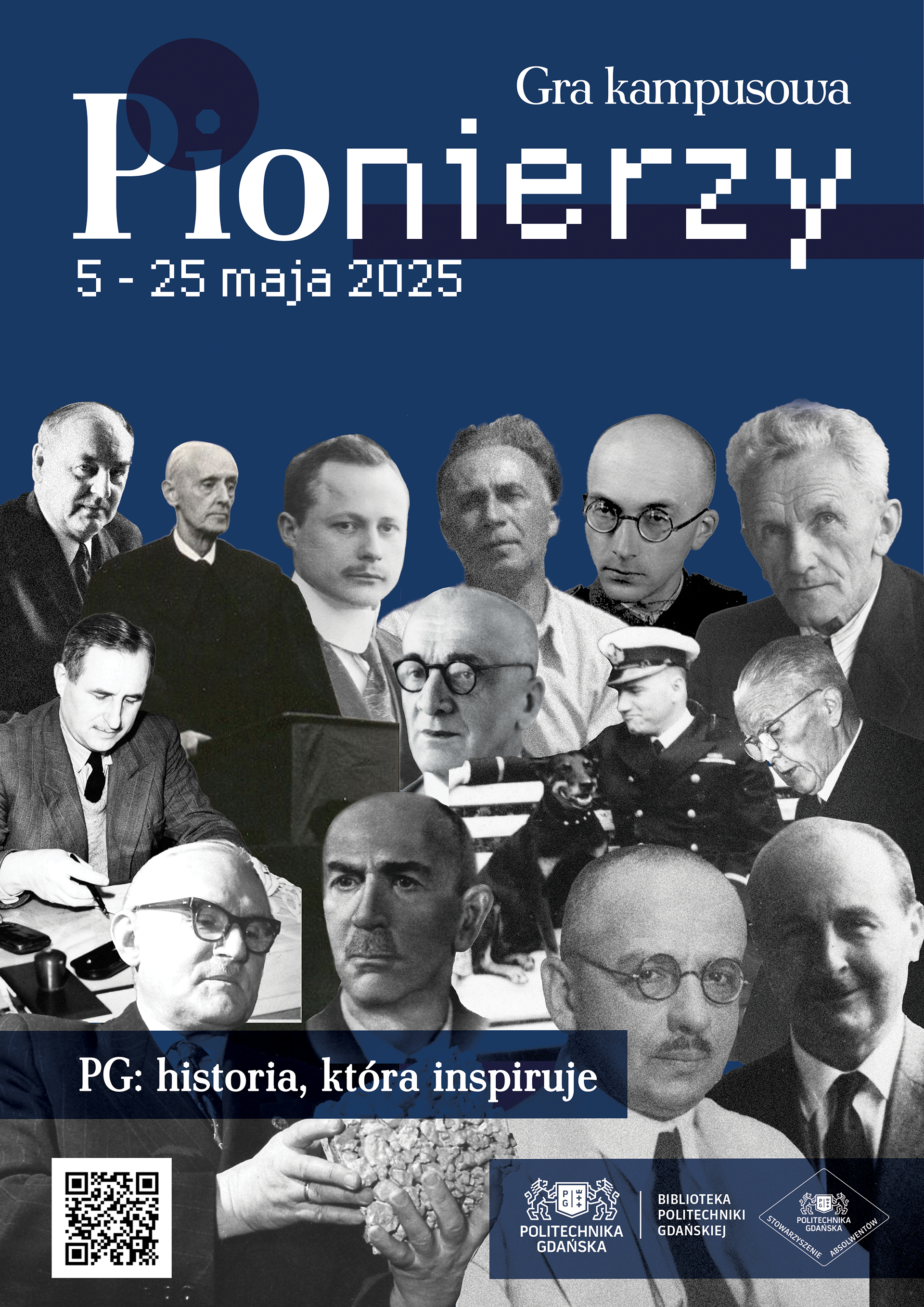 Commissioned by the Gdansk University of Technology Library, I created the visual identity and assets for a campus game, designed to educate the students on the history of the University. For the posters I used archival photography and iconography illustrating their respective fields that I designed for this purpose.